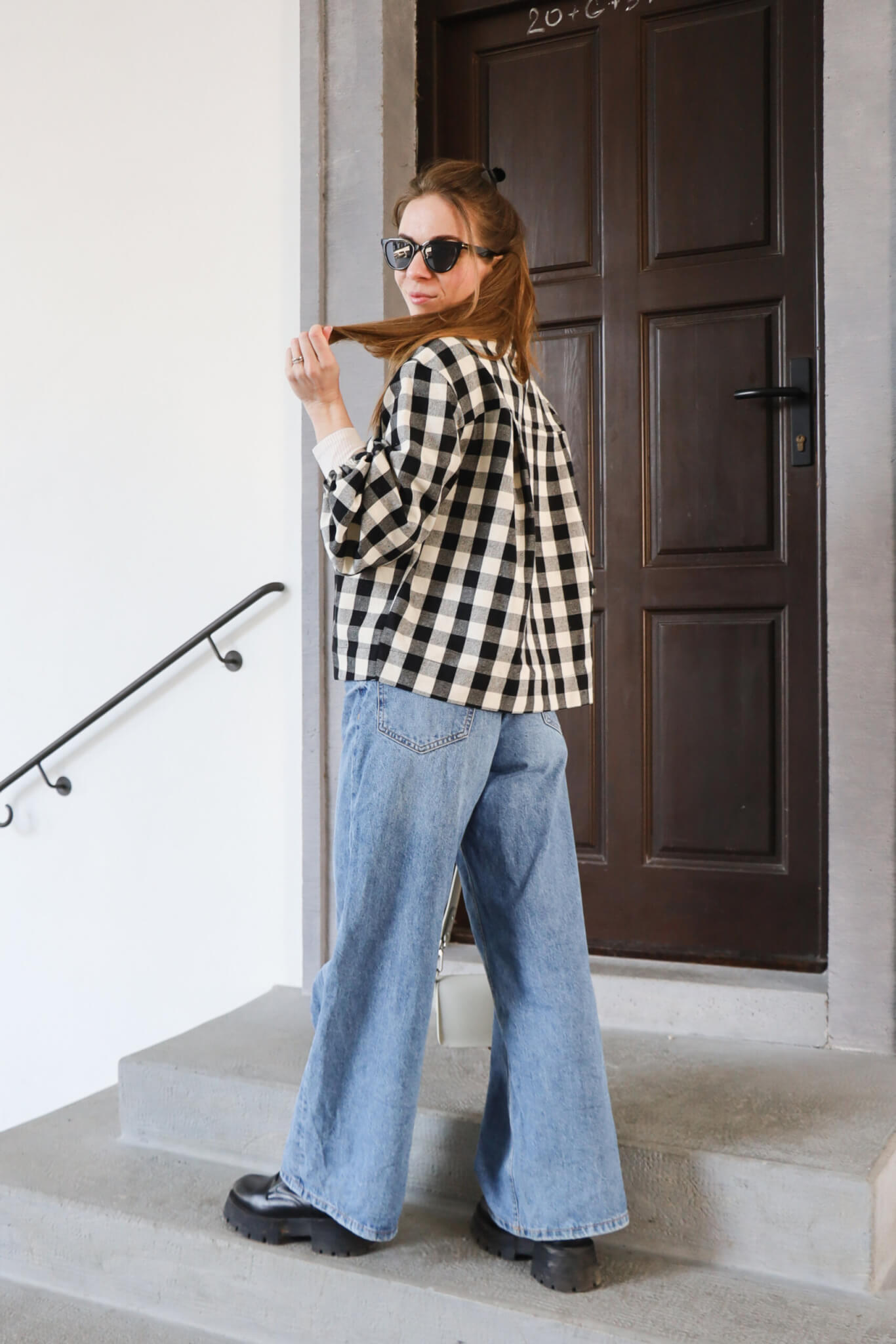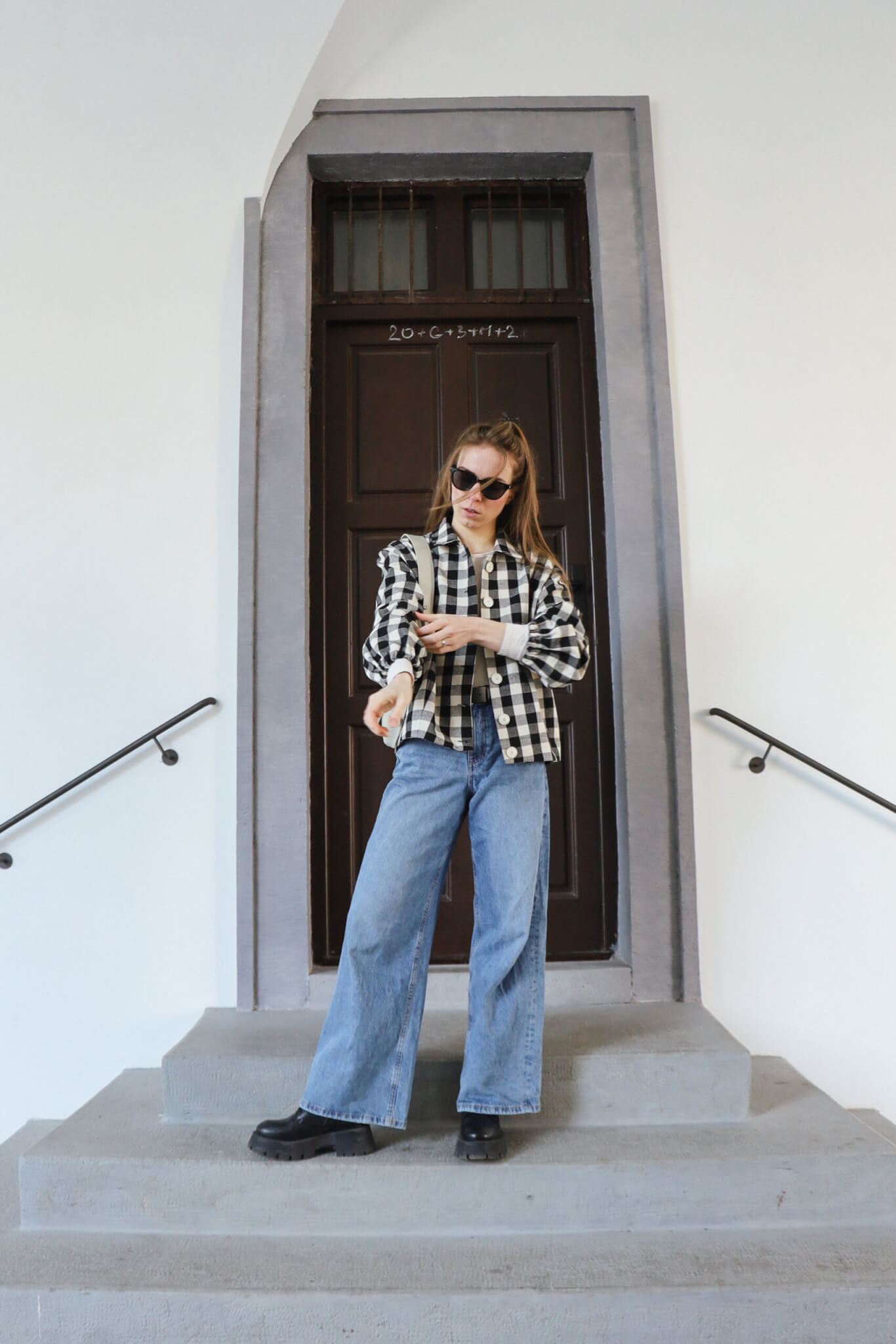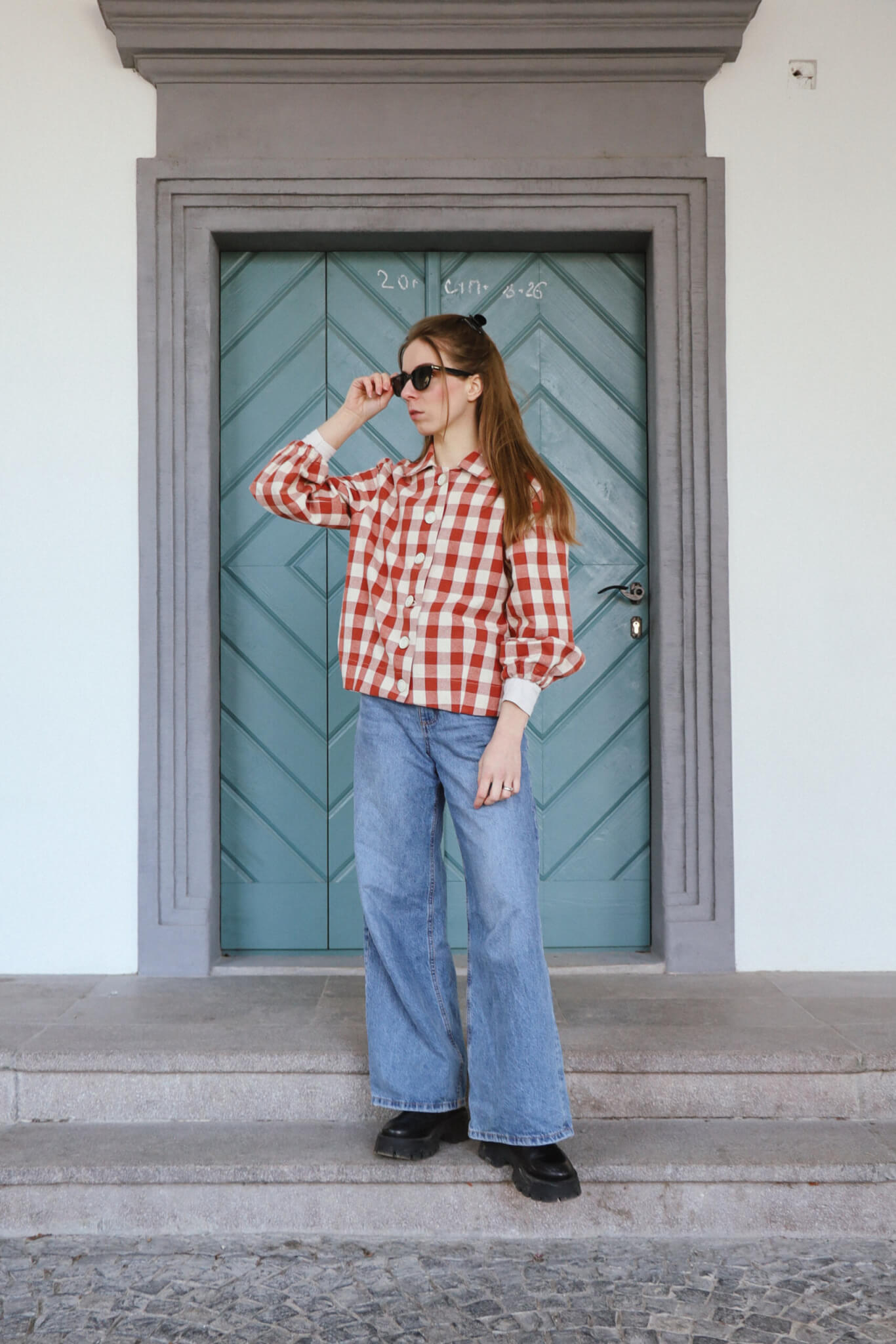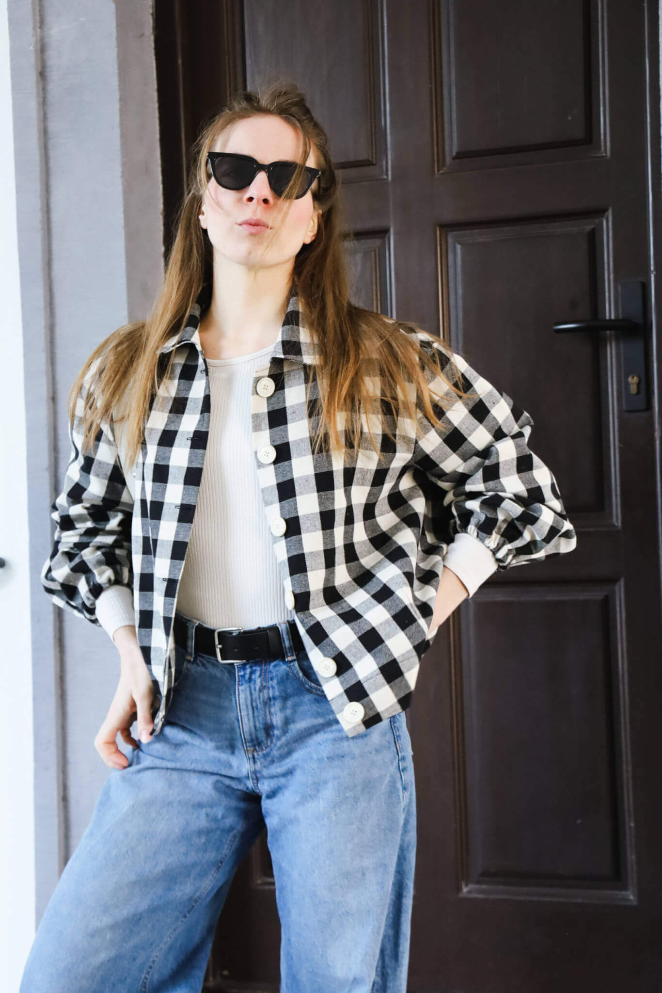 Prepracovaná károvaná bunda na gombičky v praktickej dĺžke ušitá z pevnej bavlnenej látky. Nadčasový strih, ktorý sa dobre vrství a ľahko kombinuje s kúskami tvojho šatníka.